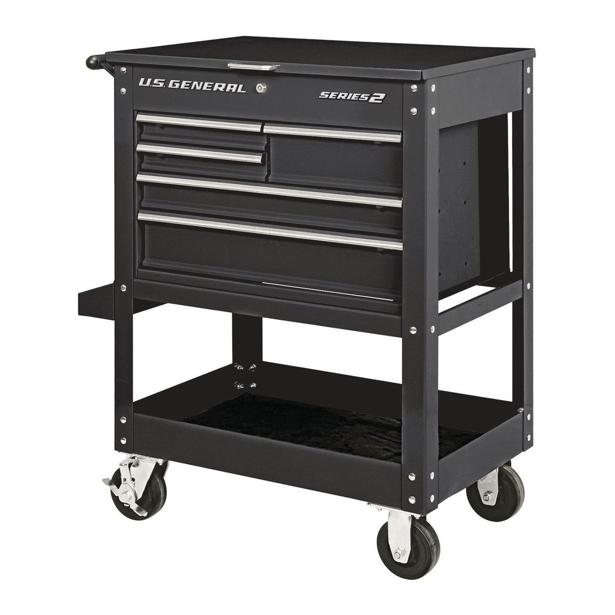 Aquí hay un carro mecánico de 5 cajones U.S. GENERAL® de grado industrial que funciona como estación de trabajo rodante con una caja de herramientas incorporada y cinco cajones. Con características de calidad como bordes de cajones enrollados, puntales de gas de 90 ° en la tapa y pestillos de cajones con resorte para mantener los cajones cerrados, este carro es ideal para el maestro mecánico. Almacene más de 15,000 pulgadas cúbicas. y 700 libras de equipo. Dos ruedas giratorias fijas y dos de bloqueo proporcionan un fácil movimiento alrededor de su área de trabajo. El acabado duradero de la capa de polvo brillante evita la oxidación y se ve muy bien.
